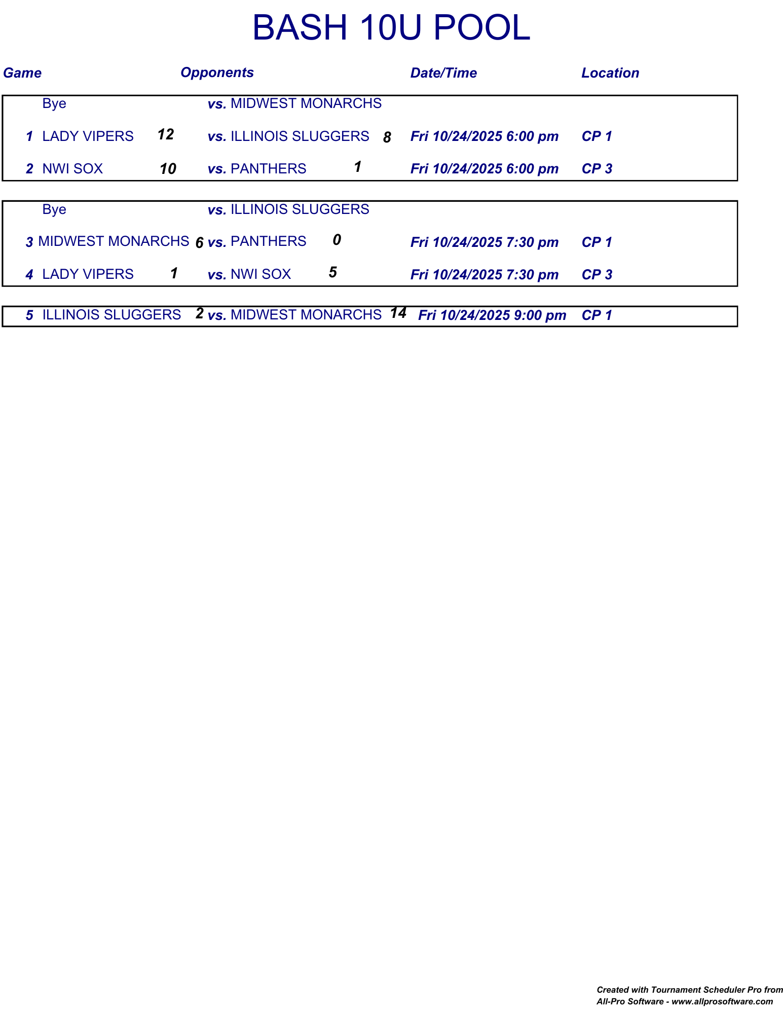 | Panthers 10u 0-2-0  | Batbusters 0-1-0  | NWI lady Vipers 0-1-0  | NL Power 0-0-0  |